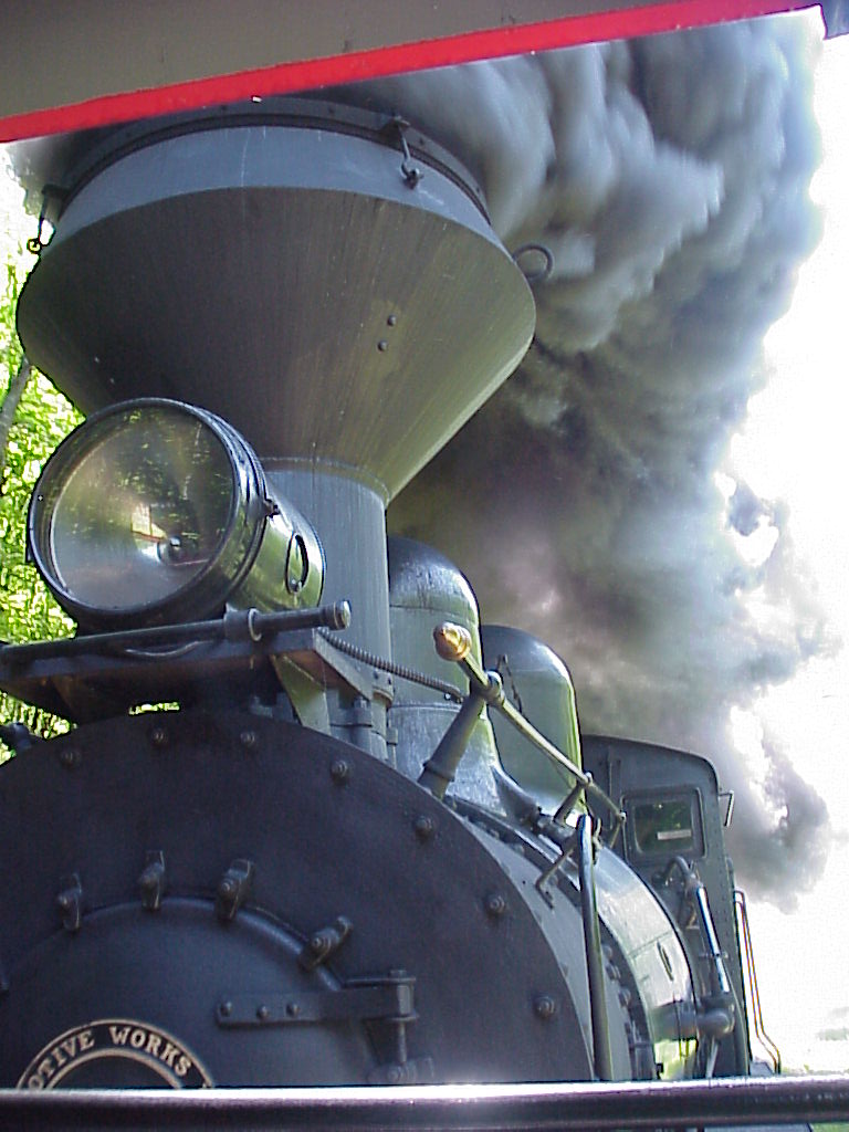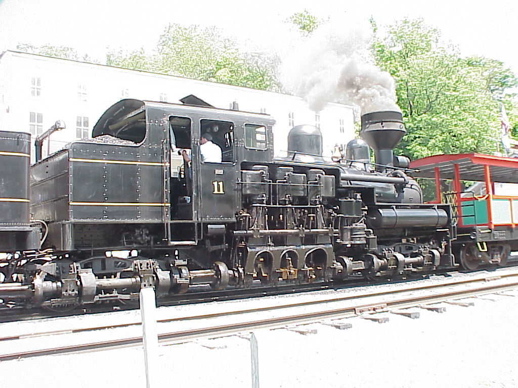 The engine, a Shay built in the Lima OH locomotive works is a "direct drive" type. It was designed for high steep climbs and slow speeds (only 6mph up hill and 8mph down hill). The 4-hour trip uses 4 tons of coal and 6,000 gallons of water.