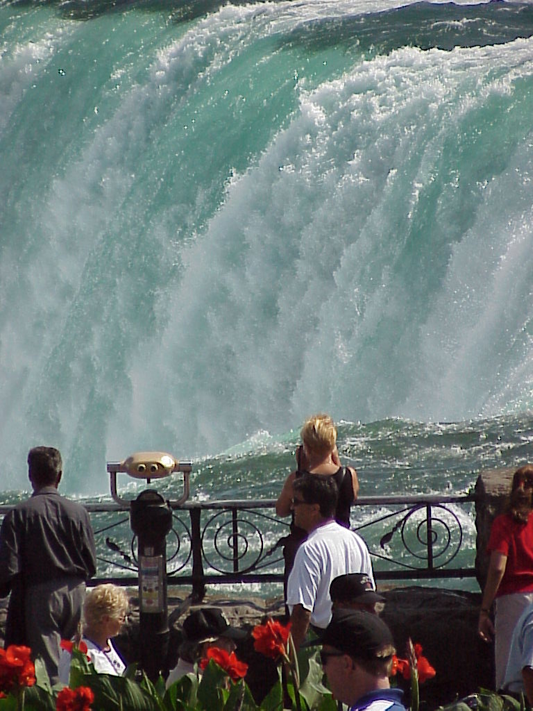 When time allows we like to dive up to Niagara Falls for lunch. It is a nice day trip, we leave about 8am and have breakfast on the way, lunch at the falls and supper the way home. Both photos here were taken from our table at the restaurant. < edge of horseshoe falls rainbow with Maid of the Mist boats > |
