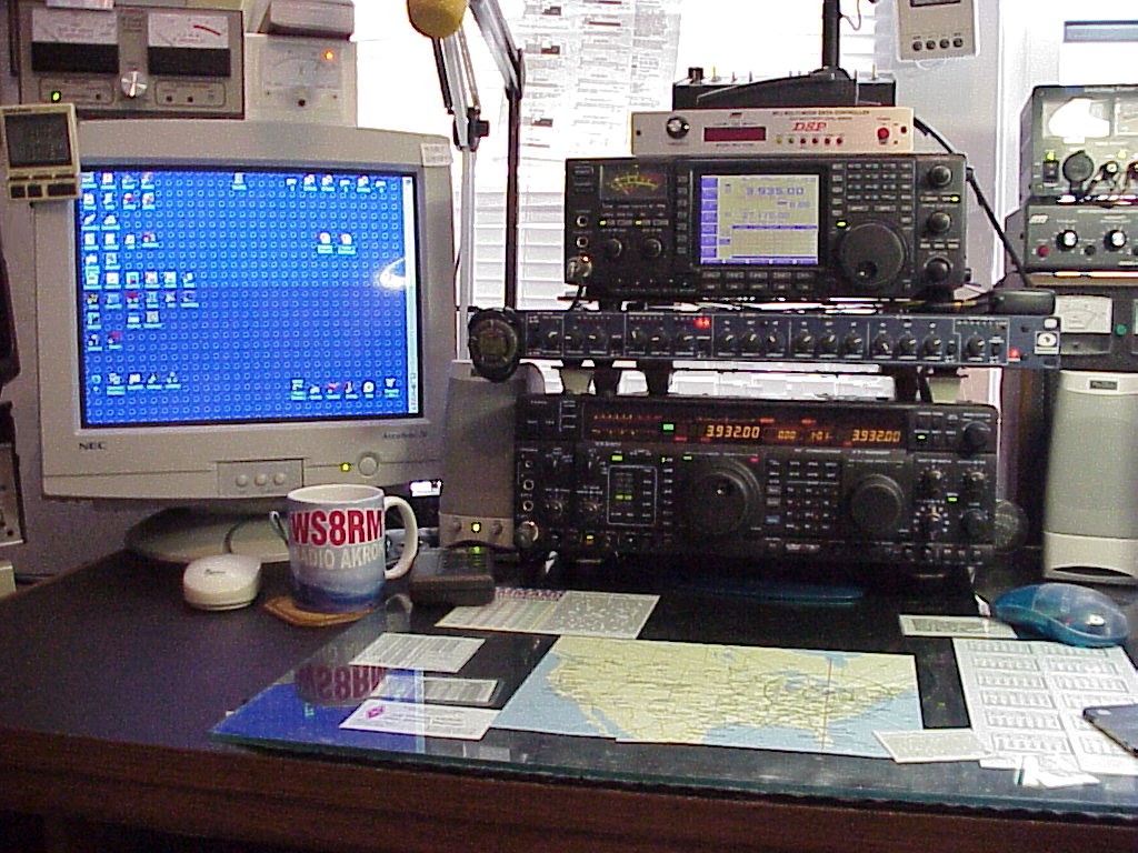 On the desk Icom IC-756 with audio via the W2IHY 8-band EQ, MFJ- multimode controller for digital modes. The band scope on the 756 is really handy with my OO activities (90% or better are the good guy type). Also the FT-1000-MP - audio via Symetrix and Heil's Goldline microphone. digital modes via the RigBlaster sound card interface. Recieve audio through a MFJ-616 Speech Enhancer. Also visible is the RF Power digital power SWR meter with analog display. |