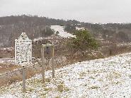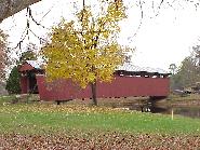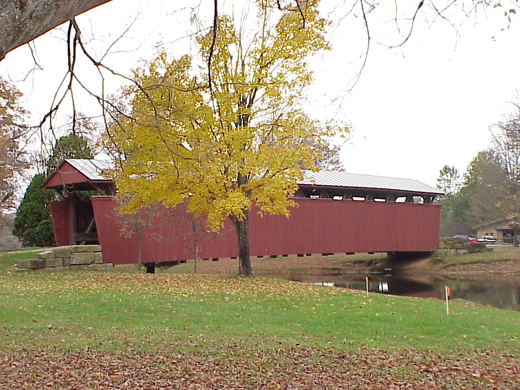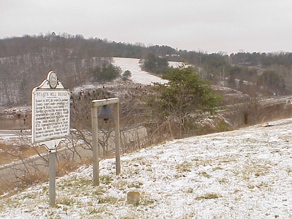This somewhat weathered sign is near the original site of the covered bridge in Staats Mill. The sign explains the construction details and costs. The picture to the left is a view of the general area of the bridge - no idea what the bell is for (fire?). The sign itself (and bell) stand in front of the old general store. |