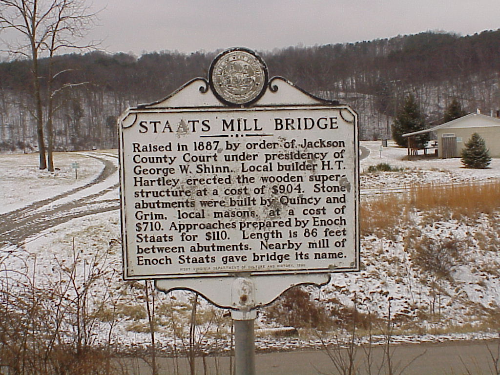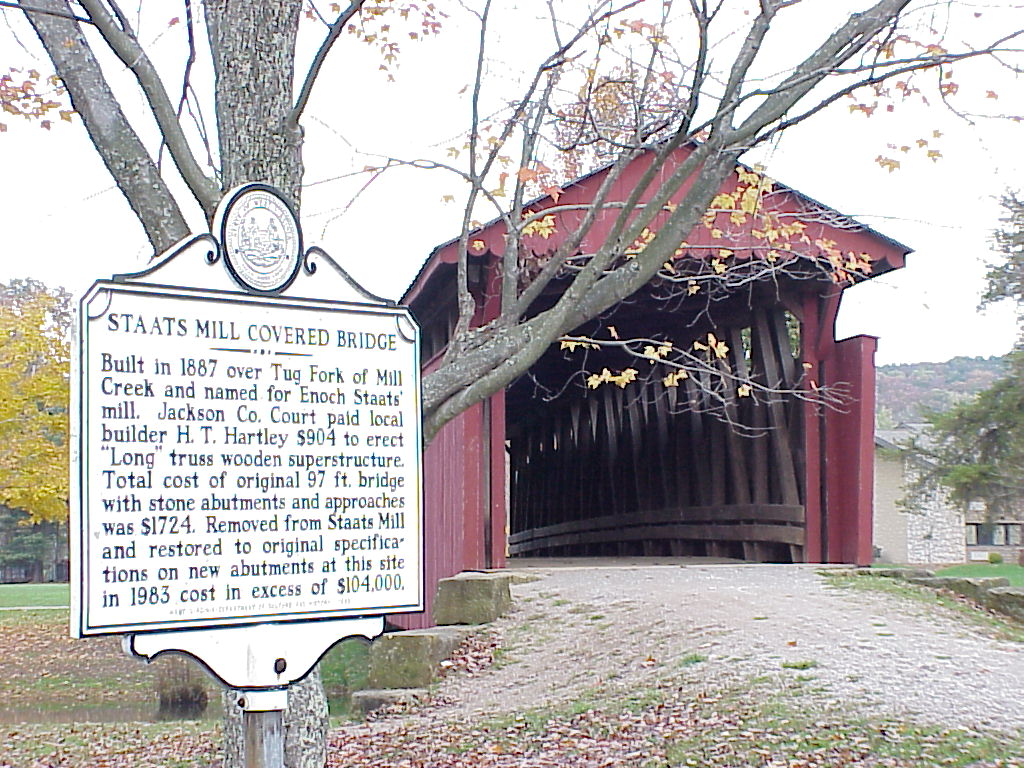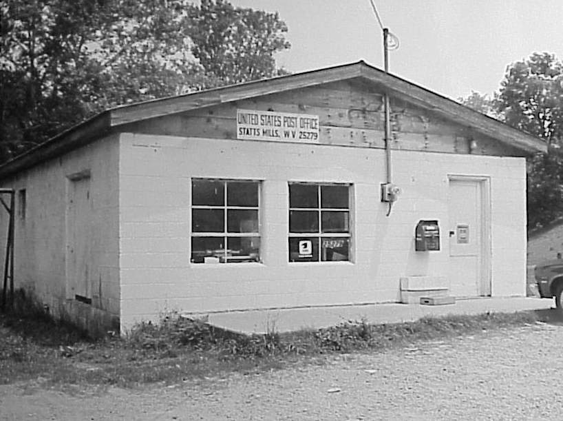The Staats Mill Covered Bridge was moved from Staats Mill WVA to Cedar Lakes Park in 1983 - and restored to original specifications. A modern bridge was built in its place in Staats Mill. This is a photo of the bridge on its original site and the Statts Mill post office as it was in 1974. The post office spelled Staats as Statts since they already had a Stoats Mill location, and hand written address could be confused. This was done before ZIP codes were used. |